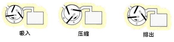 工作原理是在带有吸气阀和排气阀的圆形泵体(定子)内,装有一个偏心转子在转子槽中靠离心力运动的三片叶片,这些叶片将泵分隔成三部分,它们的容积随着转子的转动,周期性地变化,完成气体的抽吸、压缩、排除过程,从而使抽吸口处的气体被抽吸,形成真空。
